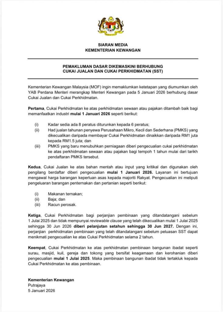 Kementerian Kewangan Malaysia (MOF) ingin memaklumkan ketetapan yang diumumkan oleh YAB Perdana Menteri merangkap Menteri Kewangan pada 5 Januari 2026 berhubung dasar Cukai Jualan dan Cukai Perkhidmatan.