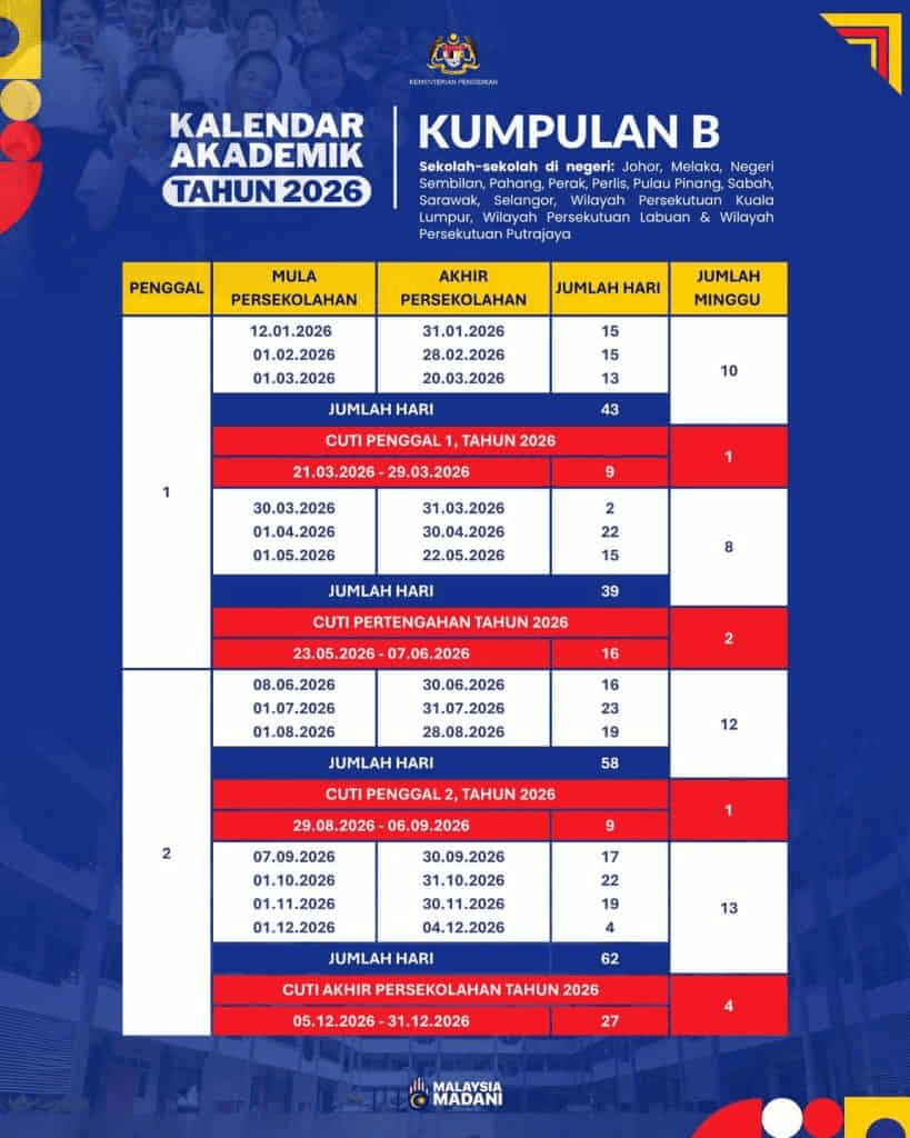 Untuk kumpulan B, berikut ialah Kalendar Akademik bagi tahun 2026: