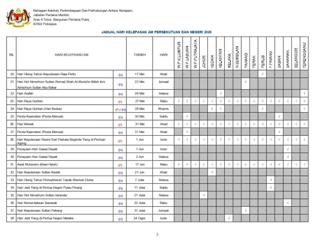 - Hari Raya Aidilfitri: 21 Mac 2026 (Sat) – 22 Mac 2026 (Sun)