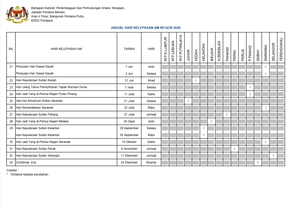 Berikut pula dikongsikan senarai penuh tarikh-tarikh cuti umum bagi tahun 2026 untuk setiap negeri di Malaysia seperti yang dikongsikan oleh Jabatan Perdana Menteri melalui www.kabinet.gov.my/hari-kelepasan-am/