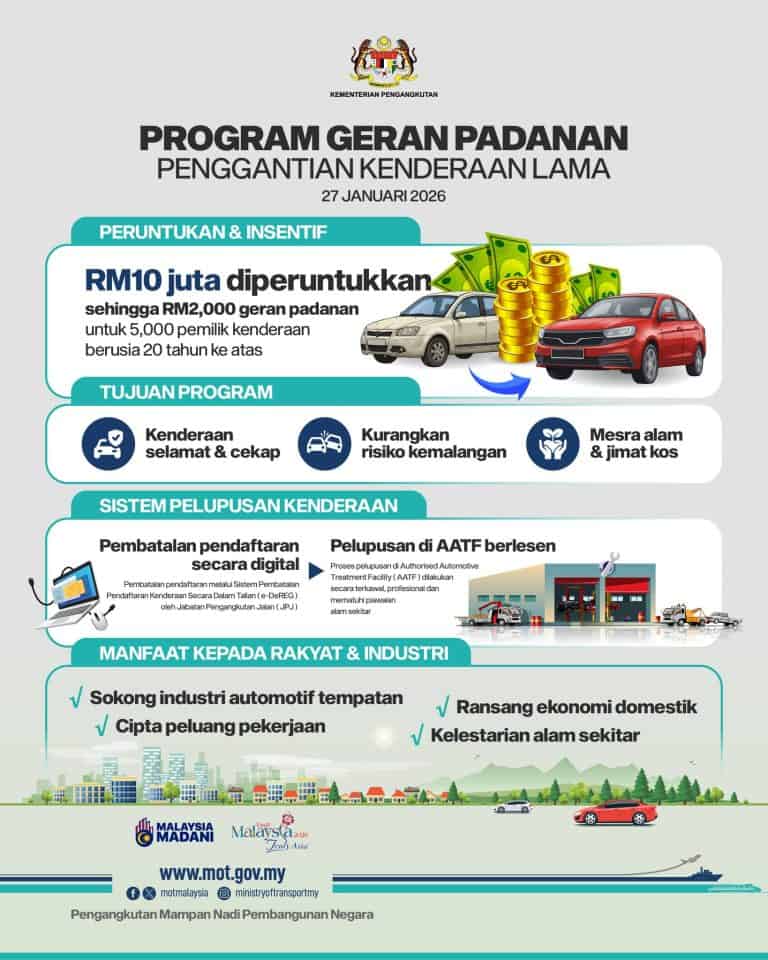 Kerajaan MADANI melalui Kementerian Pengangkutan Malaysia (MOT) telah melancarkan Program Geran Padanan Penggantian Kenderaan Lama, satu inisiatif nasional di bawah Belanjawan 2026 yang bertujuan menggalakkan pemilik kenderaan berusia 20 tahun ke atas menggantikan kenderaan lama dengan model baharu yang lebih selamat, cekap tenaga dan mesra alam.