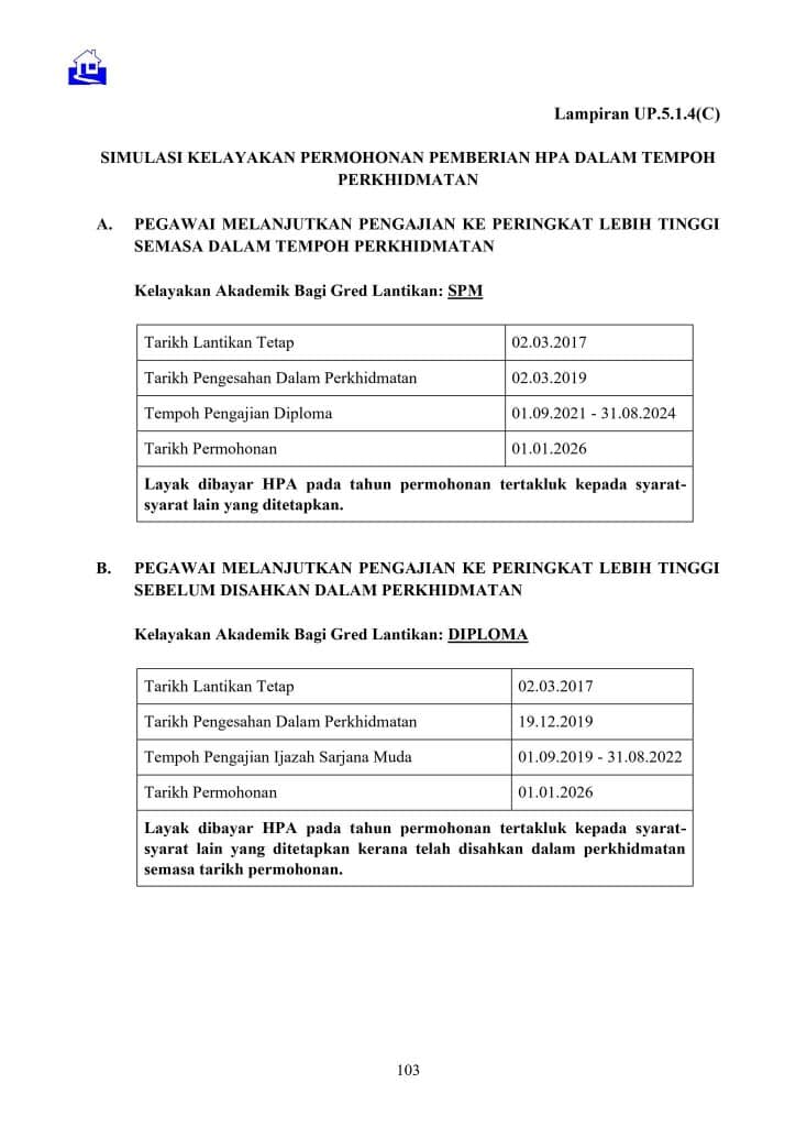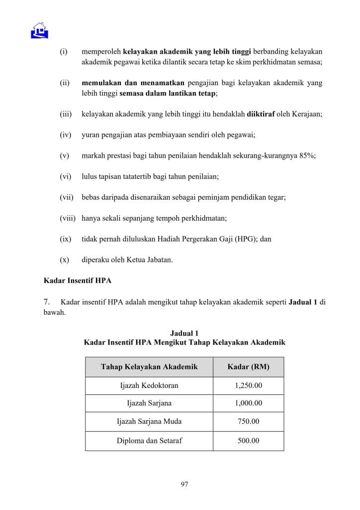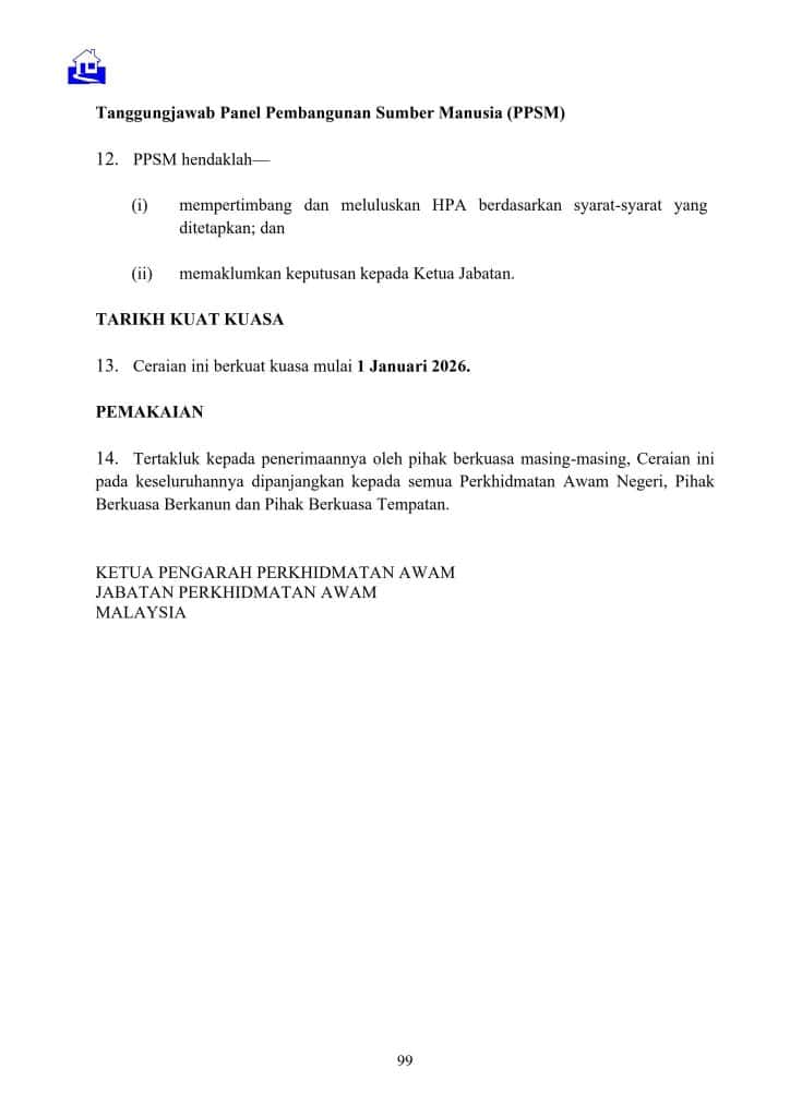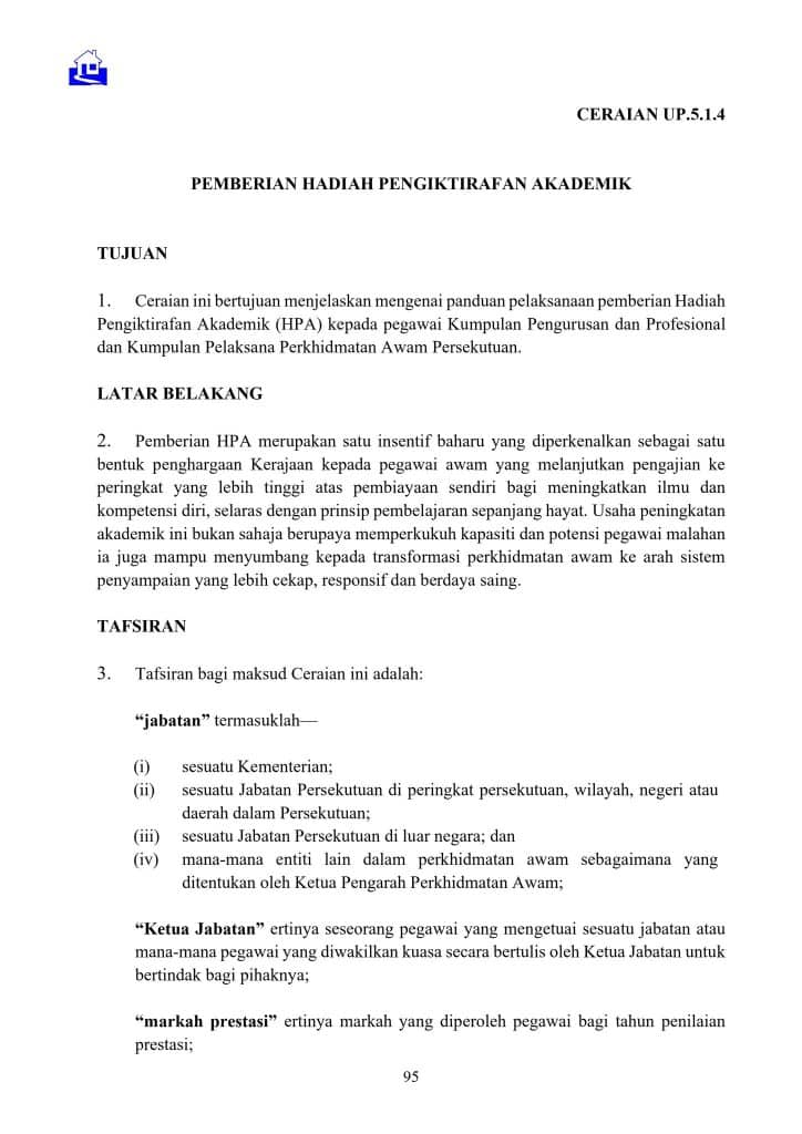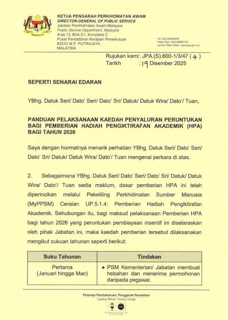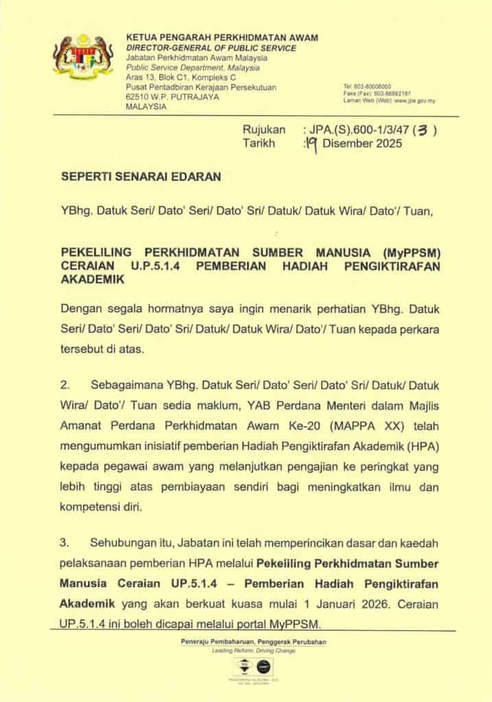 Sehubungan itu, Jabatan ini telah memperincikan dasar serta kaedah pelaksanaan pemberian HPA melalui Pekeliling Perkhidmatan Sumber Manusia Ceraian UP.5.1.4 – Pemberian Hadiah Pengiktirafan Akademik, yang akan berkuat kuasa mulai 1 Januari 2026. Pekeliling tersebut boleh diakses melalui portal MyPPSM.