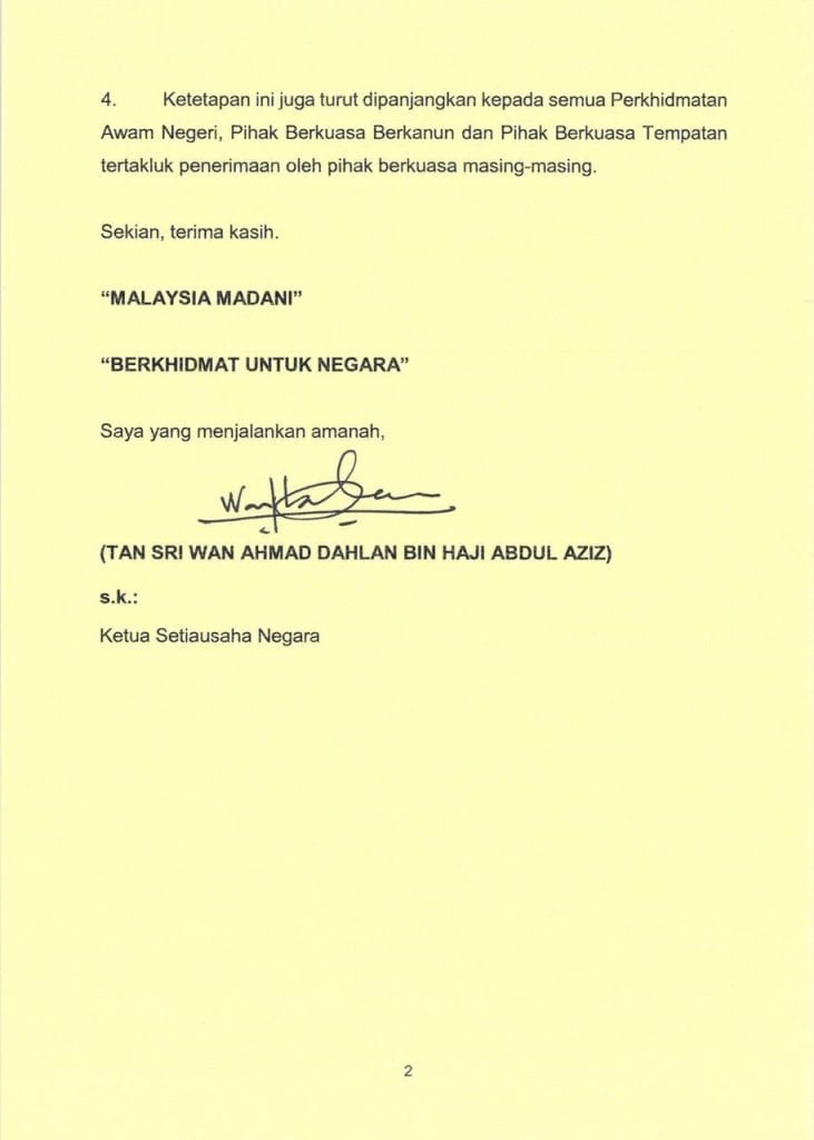 Ketetapan ini turut dipanjangkan kepada semua Perkhidmatan Awam Negeri, Pihak Berkuasa Berkanun dan Pihak Berkuasa Tempatan, tertakluk kepada penerimaan dan kelulusan pihak berkuasa masing-masing.