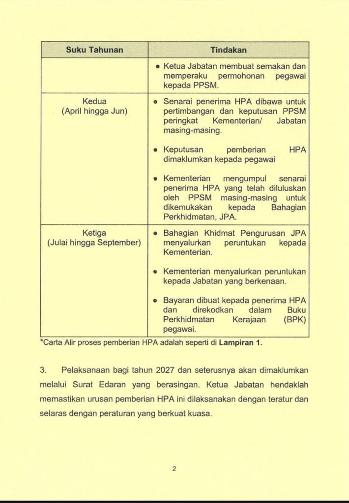 Kaedah pelaksanaan Pemberian HPA bagi tahun 2026 mengikut suku tahunan adalah seperti berikut: