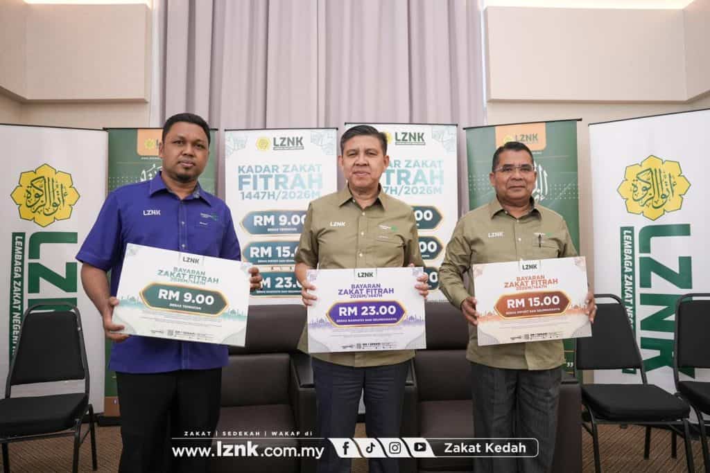Lembaga Zakat Negeri Kedah (LZNK) menetapkan kadar zakat fitrah bagi tahun 1447H /2026 iaitu harga RM 9.00, RM 15.00, RM 23.00