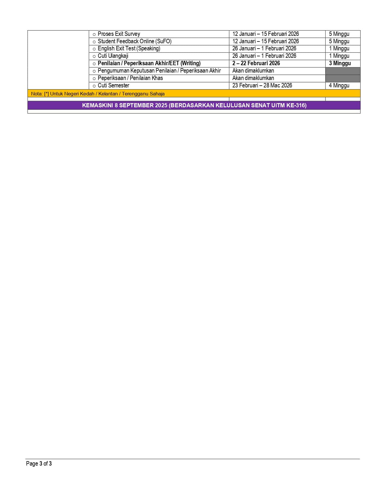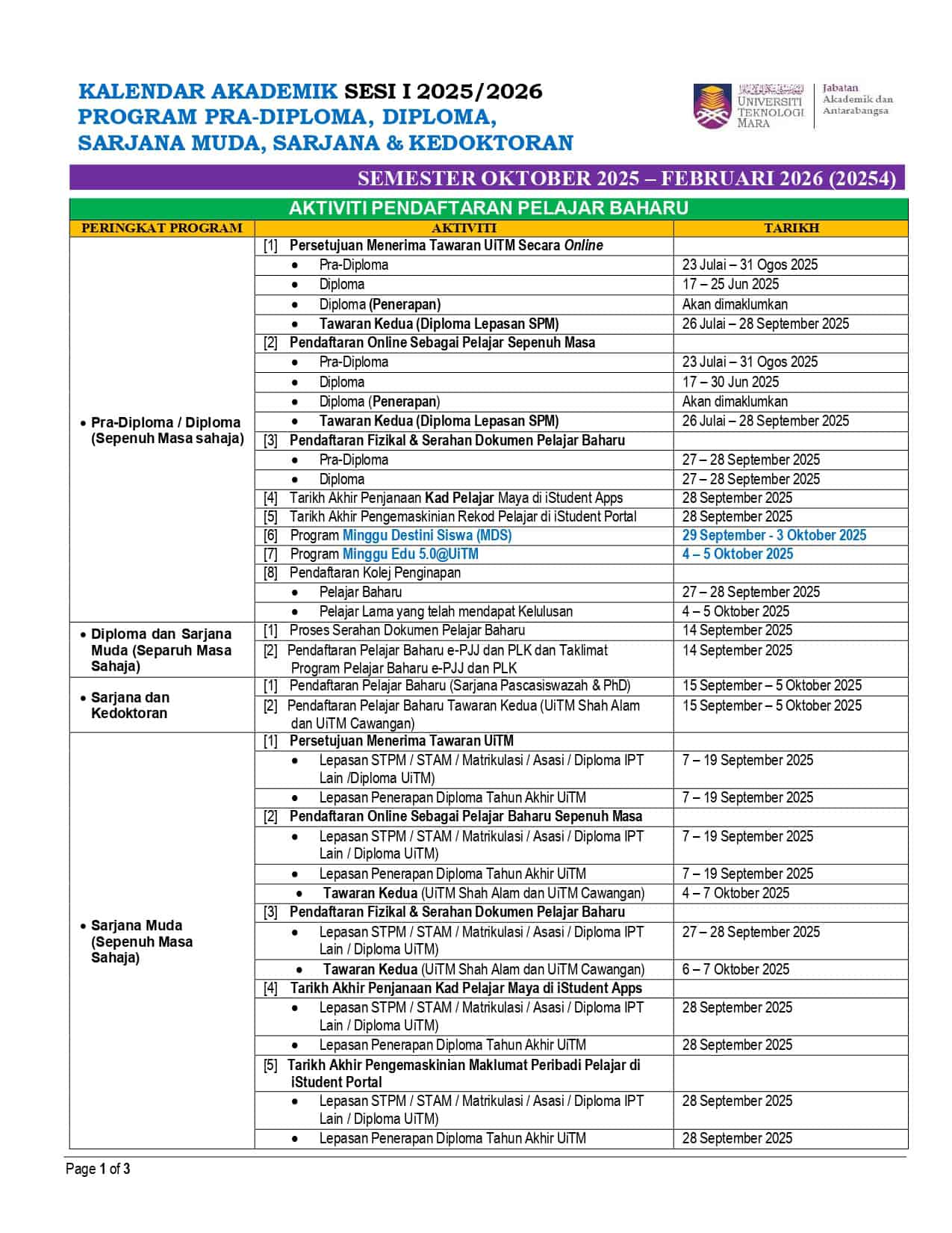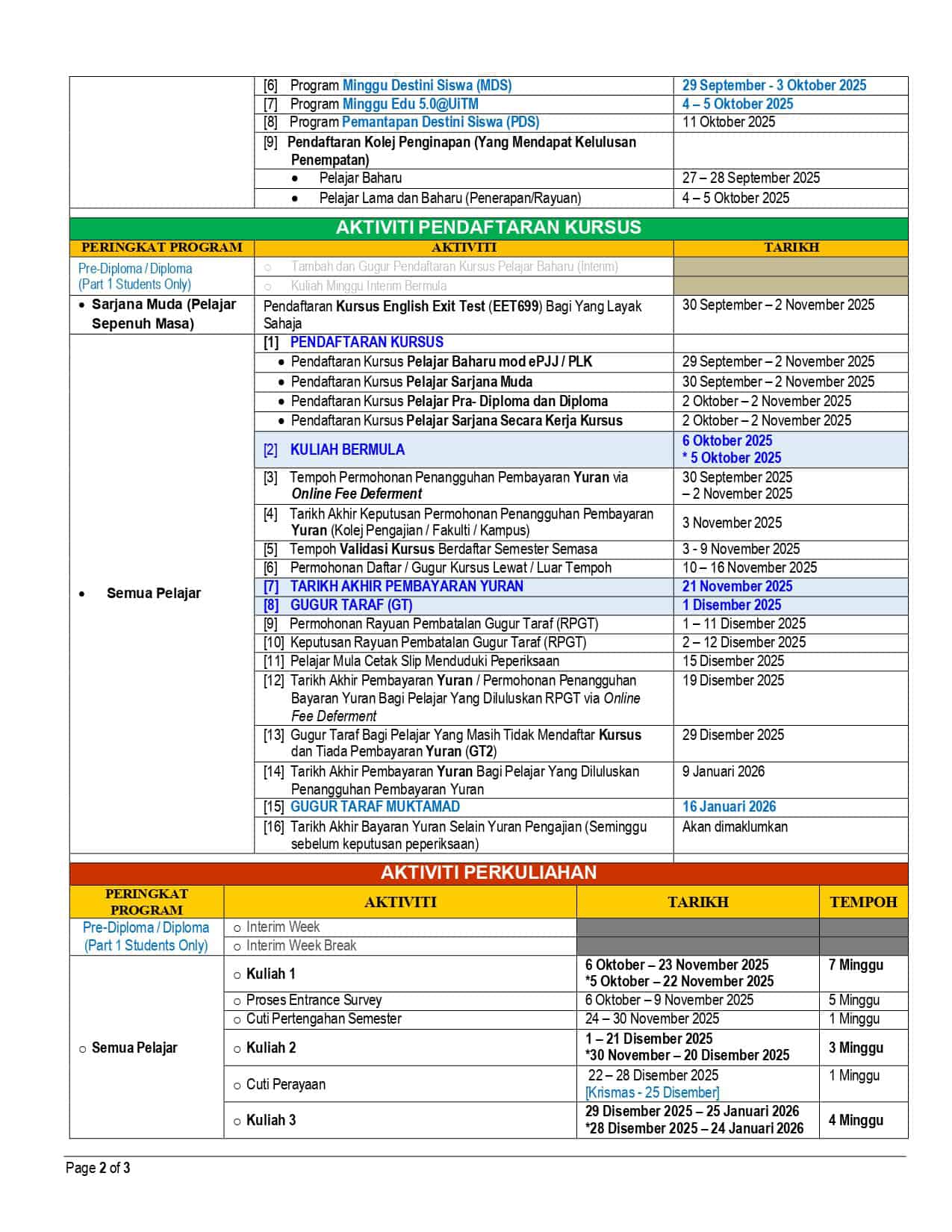 Rujuk KALENDAR AKADEMIK UiTM SEMESTER OKTOBER 2025 – FEBRUARI 2026 di bawah.
