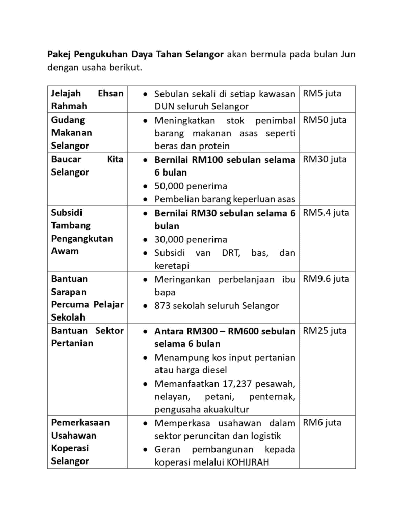 Pakej Pengukuhan Daya Tahan Selangor akan bermula pada bulan Jun dengan usaha berikut: