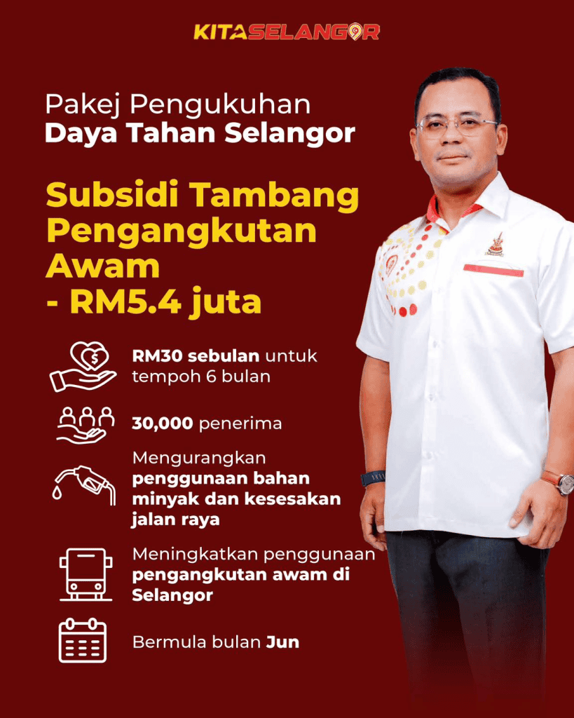 Subsidi sebanyak RM30 sebulan selama 6 bulan diberikan kepada 50,000 warga Selangor untuk kegunaan pengangkutan awam.