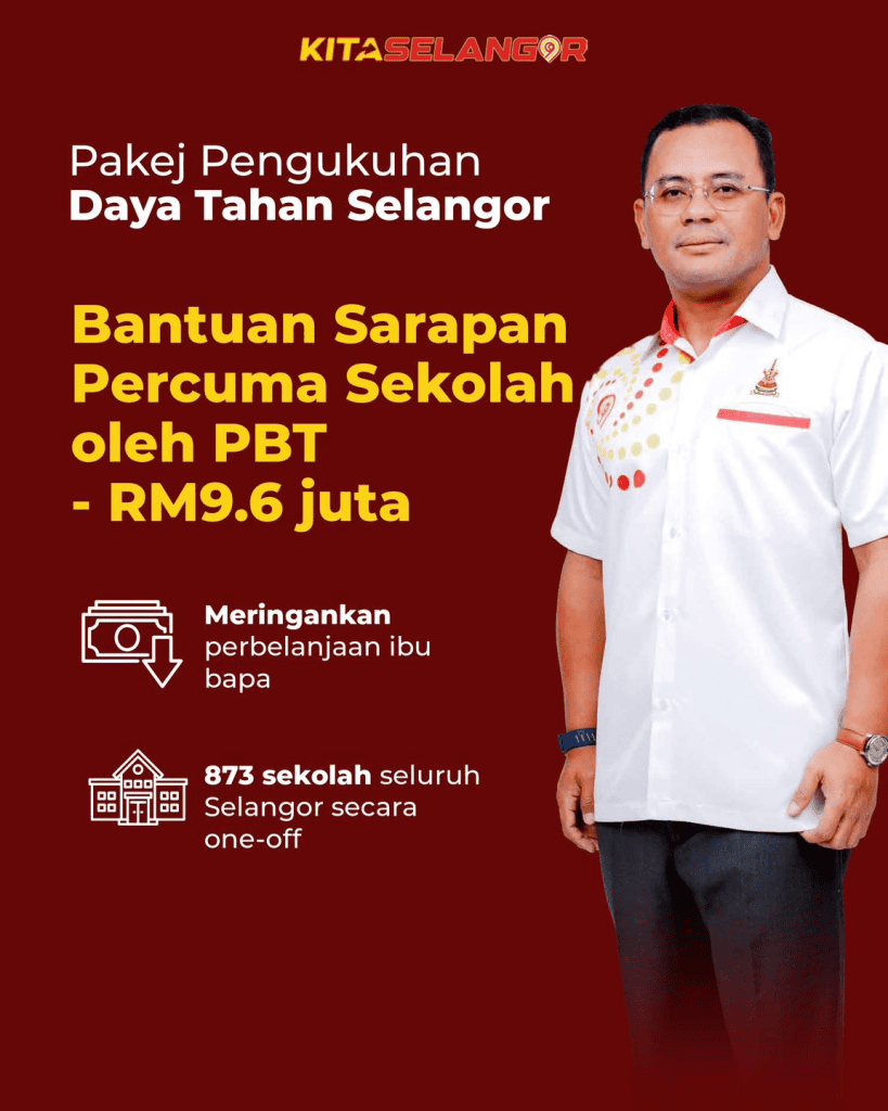 | Bantuan Sarapan Percuma Pelajar Sekolah | – Meringankan perbelanjaan ibu bapa – 873 sekolah seluruh Selangor | RM9.6 juta |