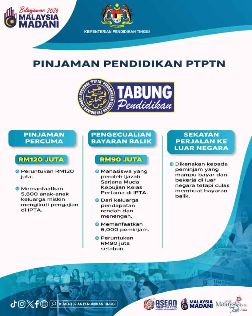 Sila rujuk maklumat lanjut melalui laman web rasmi Belanjawan 2026, Kementerian Kewangan dan PTPTN.