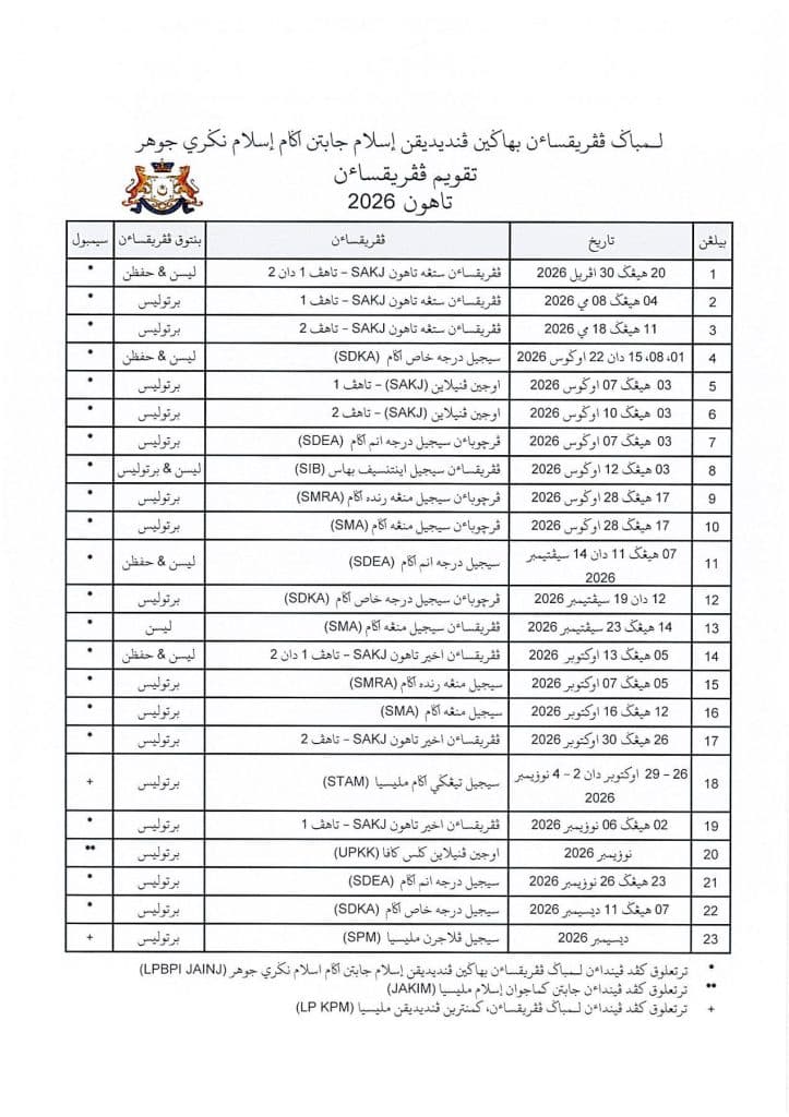 | 1 | 20 – 30 April 2026 | Peperiksaan Sijil Agama Johor (SAKJ) – Tahfiz 1 dan 2 | Lisan & Hafazan |