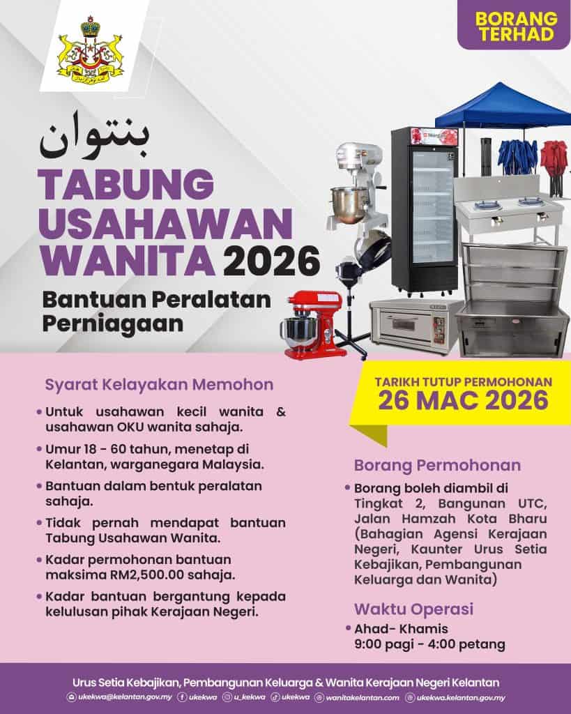 Permohonan bantuan Tabung Usahawan Wanita Kelantan bagi tahun 2026 dibuka bermula 2 Mac 2026 dan usahawan wanita di negeri tersebut dialu-alukan memohon.