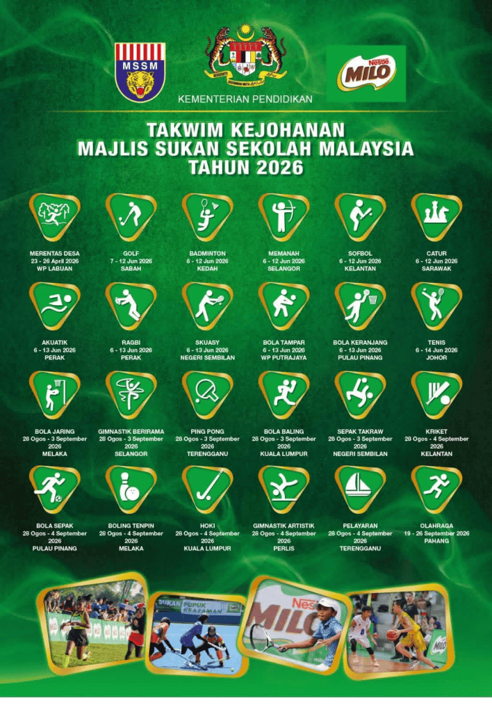 Kejohanan Majlis Sukan Sekolah Malaysia (MSSM) 2026 akan berlangsung secara berfasa melibatkan 24 jenis sukan dari April hingga September tahun ini.