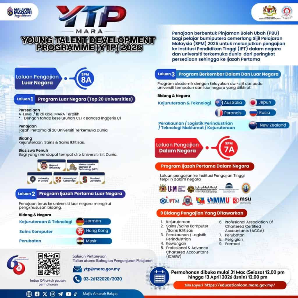Program Pembangunan Bakat Muda MARA atau YTP 2026 ialah tajaan pendidikan untuk pelajar cemerlang SPM yang ingin melanjutkan pengajian hingga ke peringkat ijazah sarjana muda di dalam atau luar negara. Layari https://educationloan.mara.gov.my untuk maklumat lanjut dan permohonan. Permohonan dibuka mulai 31 Mac (Selasa) 12.00 pm hingga 13 April 2026 (Isnin) 12.00 pm.